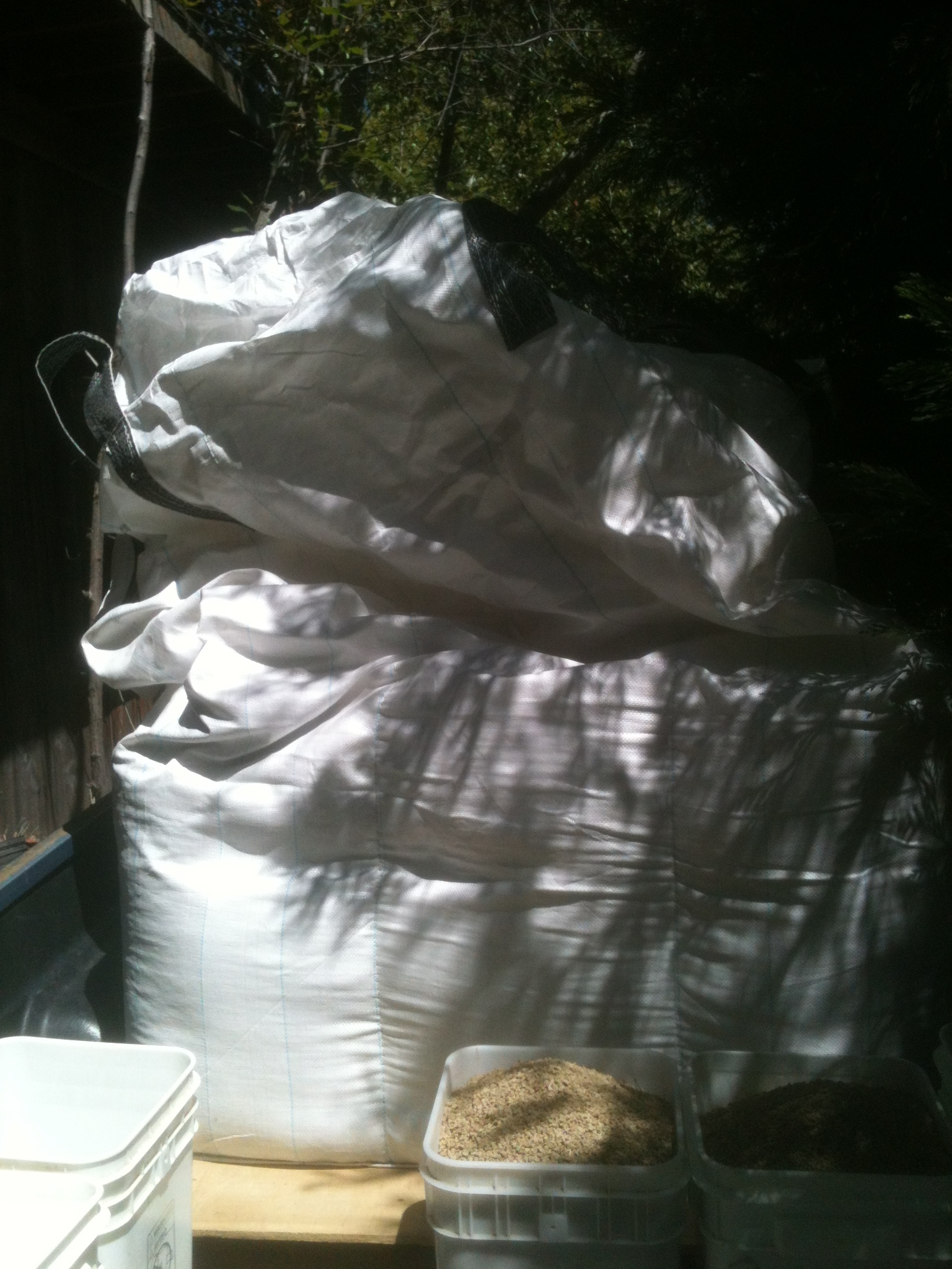 Four to five times per season, we order our feed in bulk and it comes in giant 2000 pound sacks that are made of woven plastic mesh. Needless to say 4 to 5 sacks a season really start to build up, taking up room in the barn.