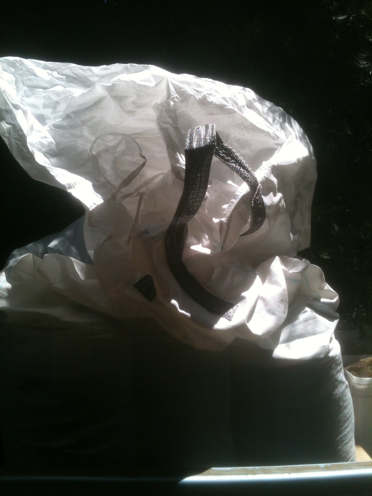 In the quest for an alternative, I hit on the idea of using these sacks for chicken housing. It could be a win-win. They are roughly 6 feet tall by 4 feet wide and our houses need a 8 x 12 foot roof. The real ah-ha moment came when I realized that if I cut the sack in half on one side and remove the bottom, the sack laid out flat becomes 4 x 12 foot tarp. Two sacks and you’ve got a roof!