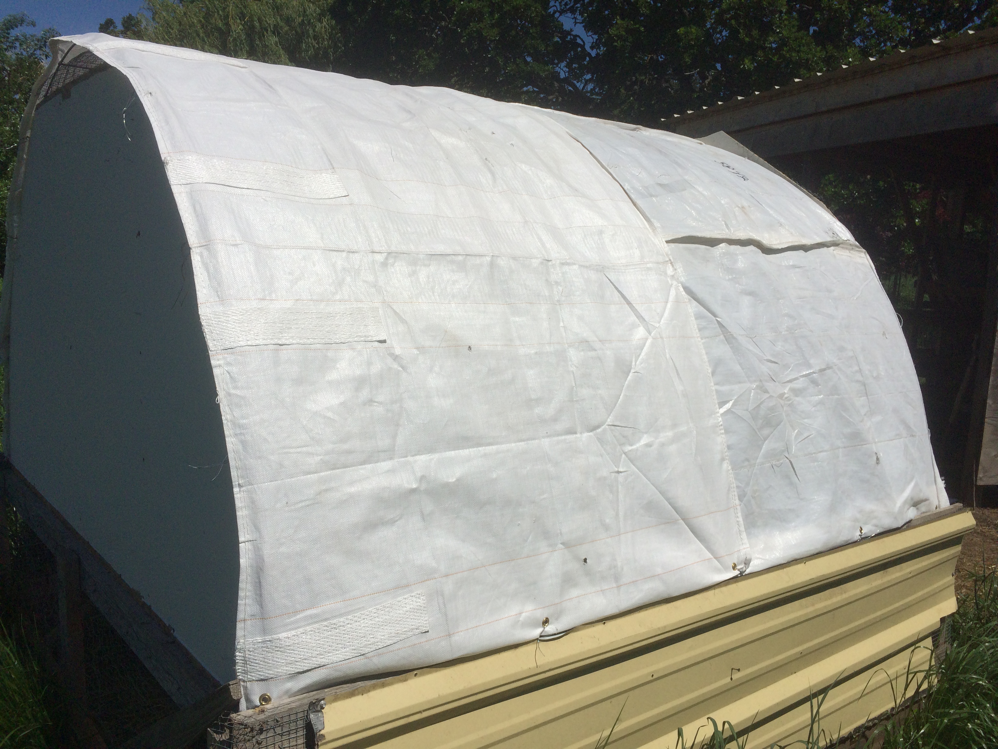 The ideal cover for our chicken house needs to be water-proof, create shade, be light-weight, and not disintegrate in direct sunlight or pollute. Challenging in its own right but add to that a shoe-string budget. This makes it nearly impossible to meet all the criteria. However.